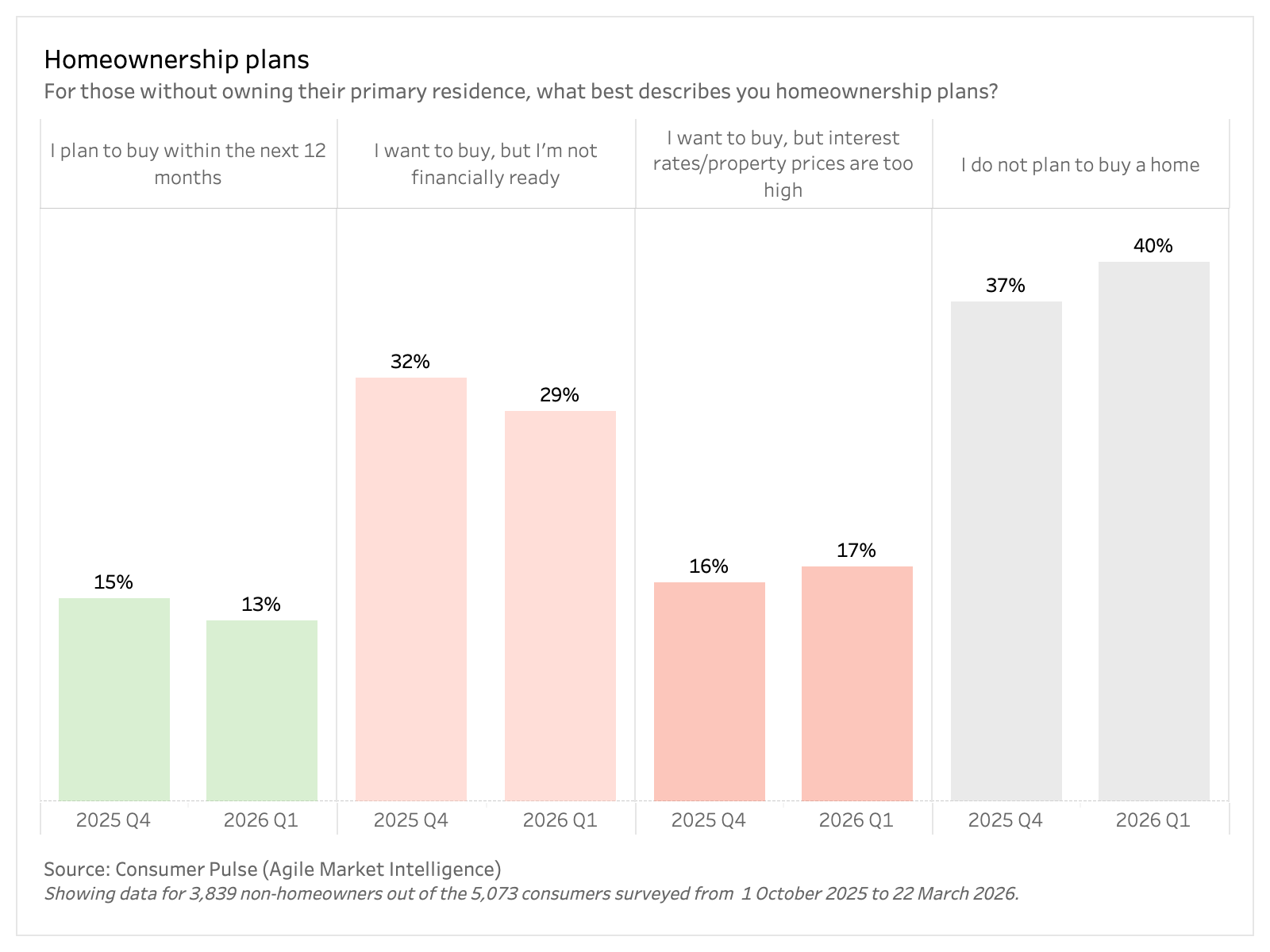 This article is based on findings from Agile Market Intelligence’s Consumer Pulse survey, conducted from 1 October 2025 to 23 March 2026. The data presented are for 3,839 non-homeowners among the 5,073 Australian consumers surveyed. A comparison of homeownership plans across age groups and states between Q1 2026 and Q4 2025 was conducted.