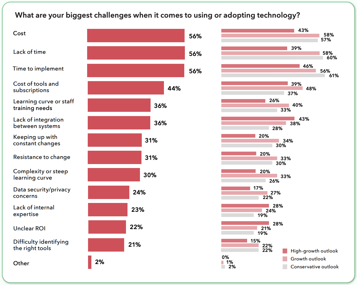 - High-growth firms also see poor system integration as a major barrier, with 43% reporting this challenge alongside cost (43%) and implementation time (46%).