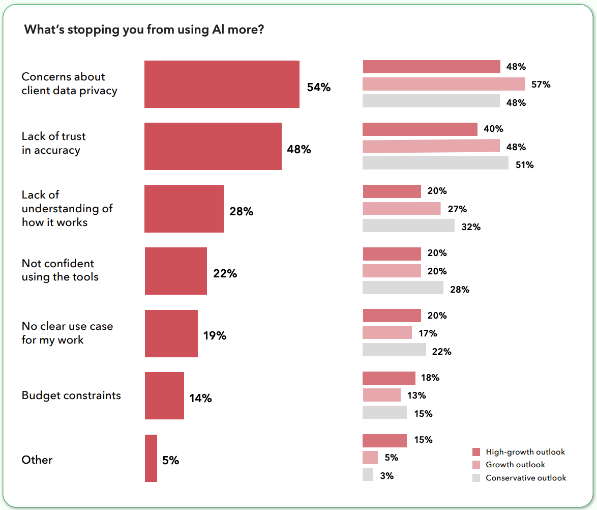 - More than half of firms (54%) cite client data privacy as a critical consideration that prevents them from deeper AI integration, followed by concerns with accuracy (48%).