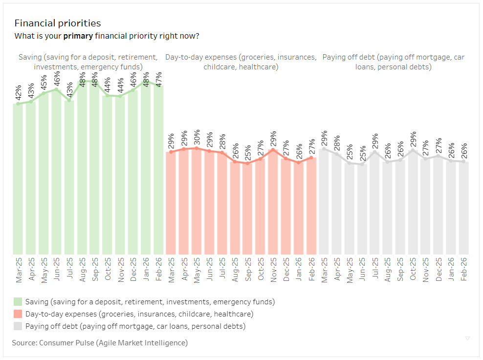Agile Market Intelligence’s Consumer Pulse surveys around 1,500 Australian consumers monthly to monitor sentiment, financial stress, and behavioural shifts across key household segments. This survey tracks consumers’ financial priorities between savings, day-to-day expenses, and debts to pay. Across the various debt statuses, savings is the consistent priority for Australians in 2026 due to the recent interest rate fall back in December 2025. It remains to be seen, however, whether this trend continues after the RBA raised the cash rate by 0.25%.