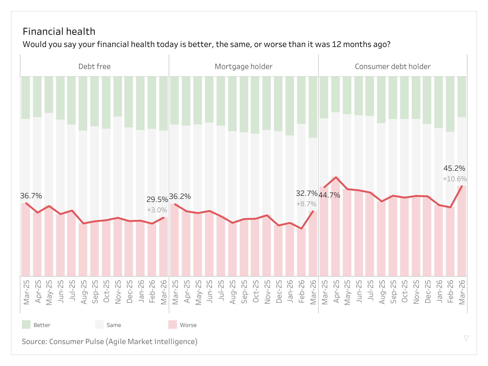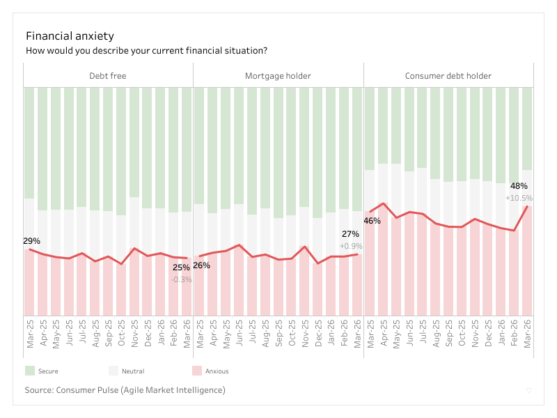 More Australians, regardless of debt status, feel that their financial situation is worse off this March 2026 compared to March last year. The largest segment of anxious consumers are consumer debt holders, seeing an increase of 10.6 percentage points reaching 45.2% overall. 3% more debt-free Australians and 8.7% more mortgage holders have also expressed concern over their financial situation.