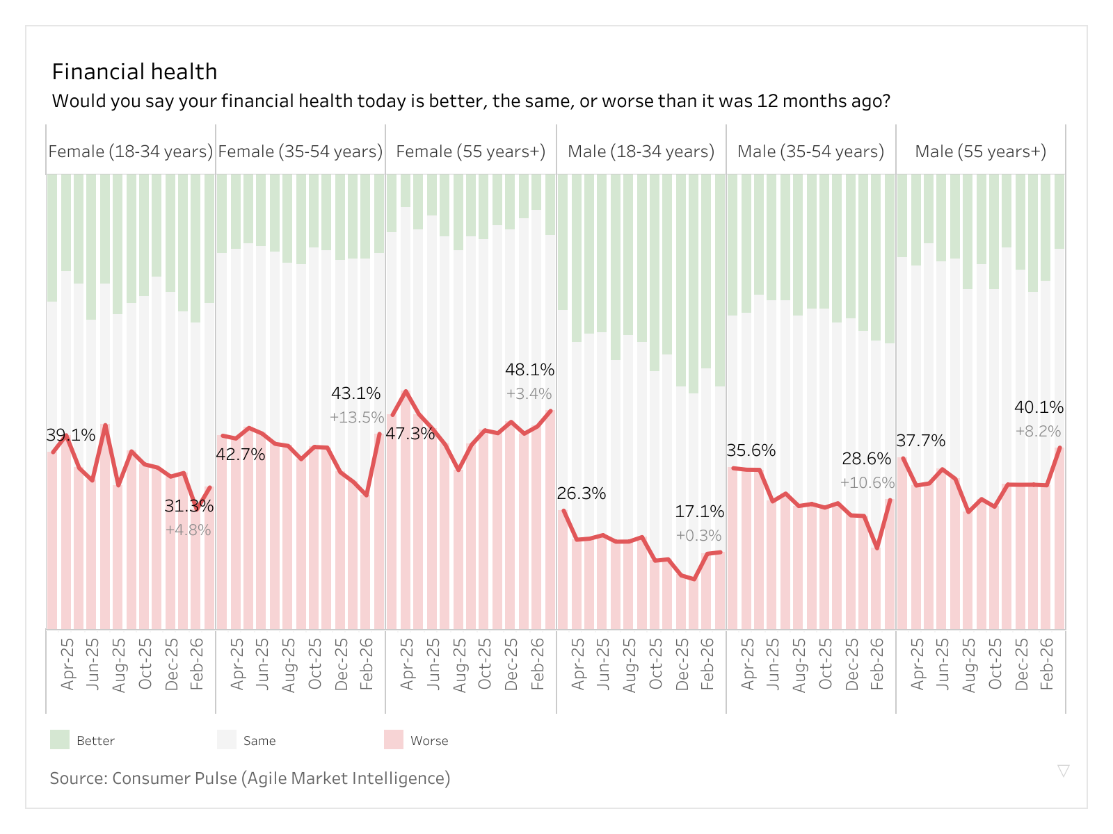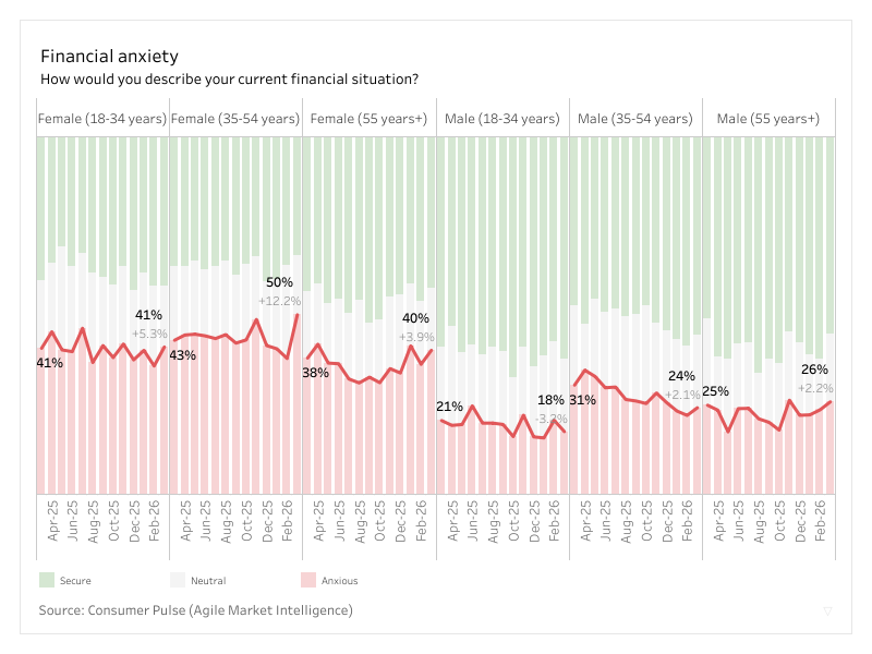 - Females aged 35-54 years old are the most financially anxious (50%) segment in March 2026.