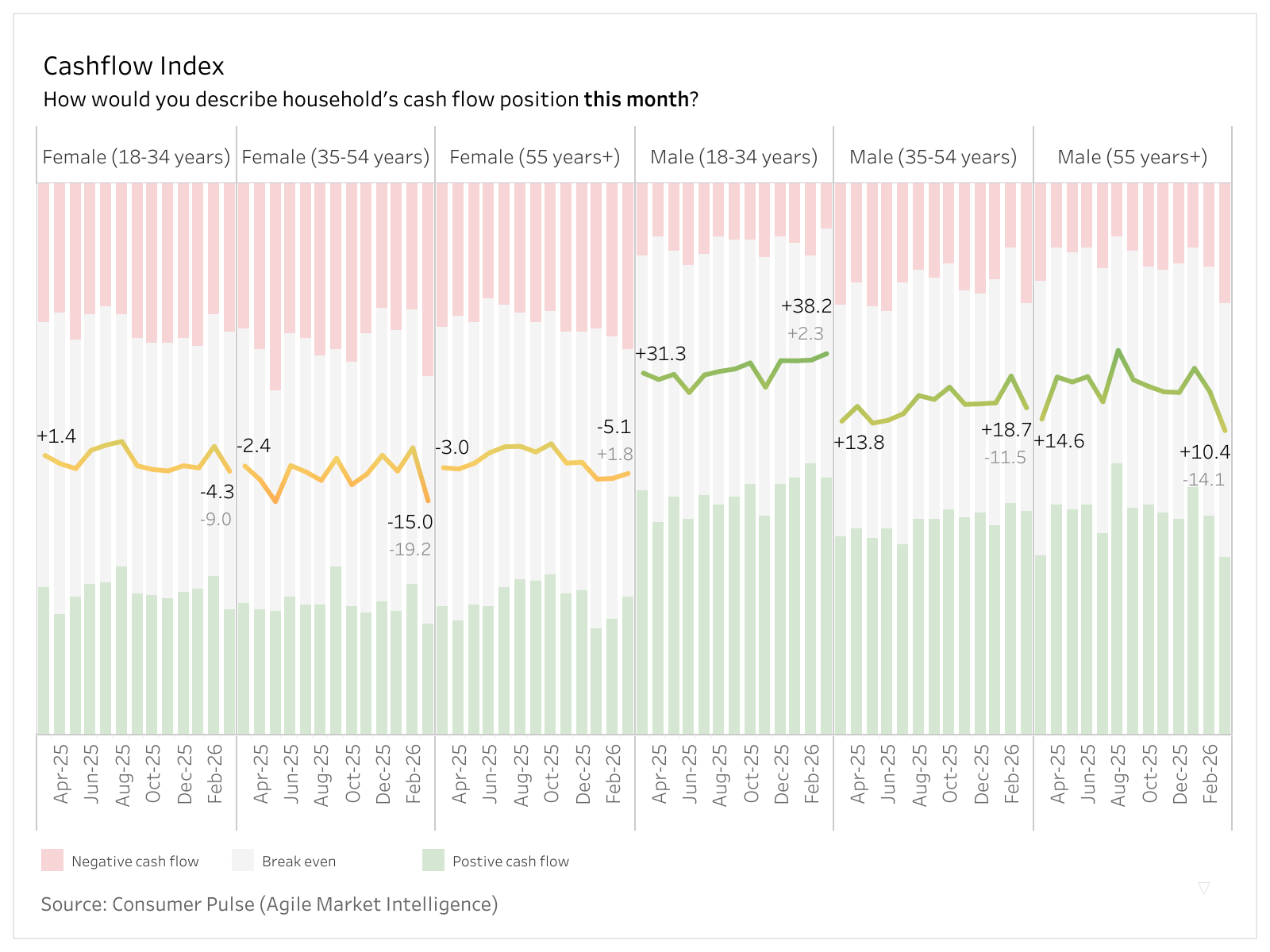 This article is based on findings from Agile Market Intelligence’s Consumer Pulse survey, conducted from March 2025 to March 2026. The survey collected responses from 19,842 Australian consumers, weighted to reflect national population profiles by age, gender, and state. The survey gathers about 1,500 responses monthly. The Consumer Pulse is a monthly tracker developed by Agile Market Intelligence to monitor consumer sentiment, financial stress, and behavioural shifts across key household segments. The survey provides a real-time view of financial wellbeing in Australia, segmented by debt status, home ownership, and other demographics.
