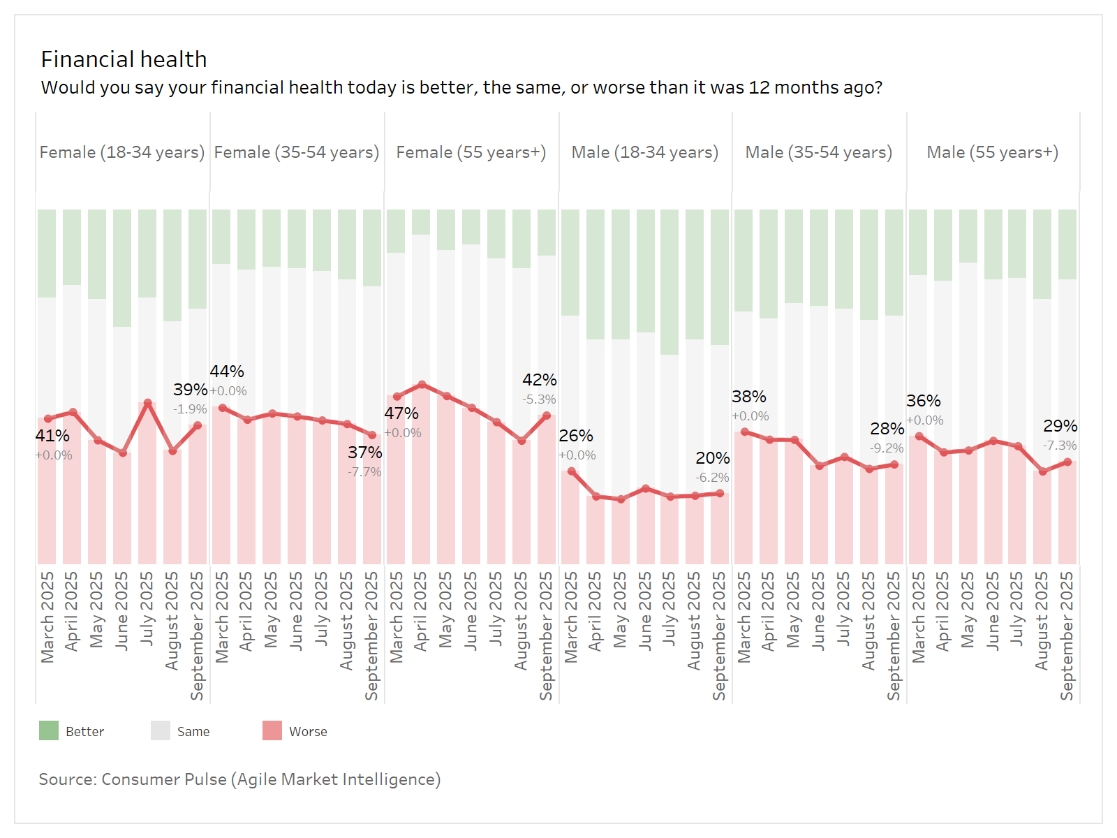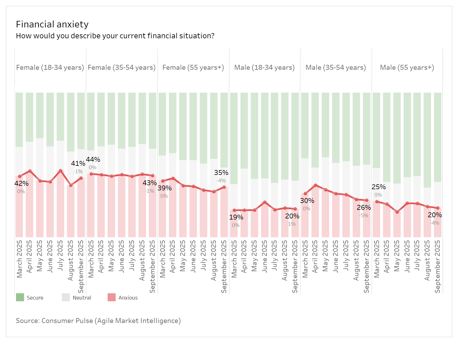 - Financial anxiety is reducing with 30% of Australian consumers reporting feeling anxious about their financial situation, down from 35% in March 2025, a level consistent with August.
