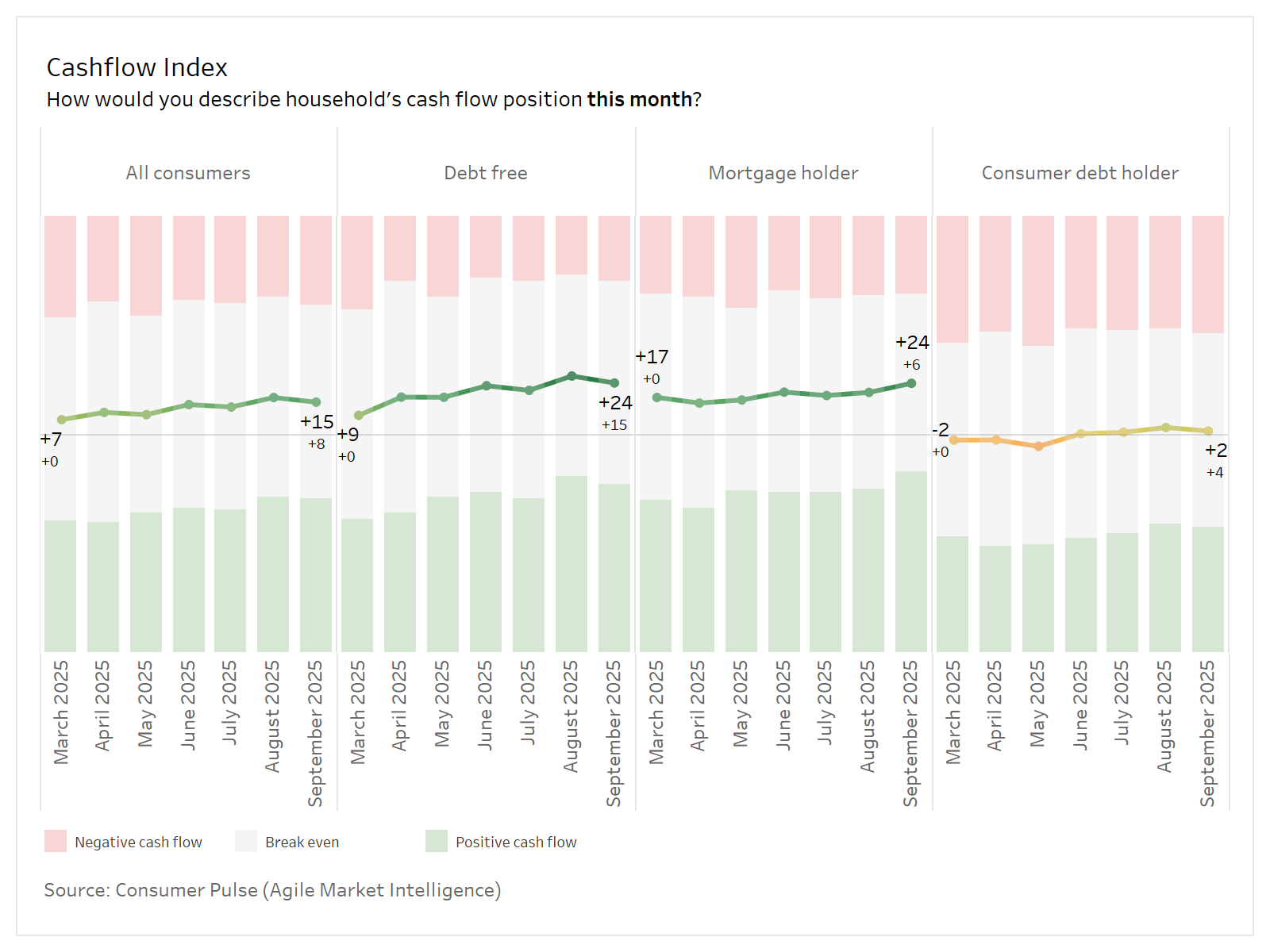 - Debt free consumers and mortgage holders report the highest level of cashflow positivity in the index, with +24 scores respectively in September. However, consumer debt holders continue to report neutral cashflow with equal amounts of these consumers having positive and negative cashflow months, an index score consistent with March, despite improved financial confidence conditions.