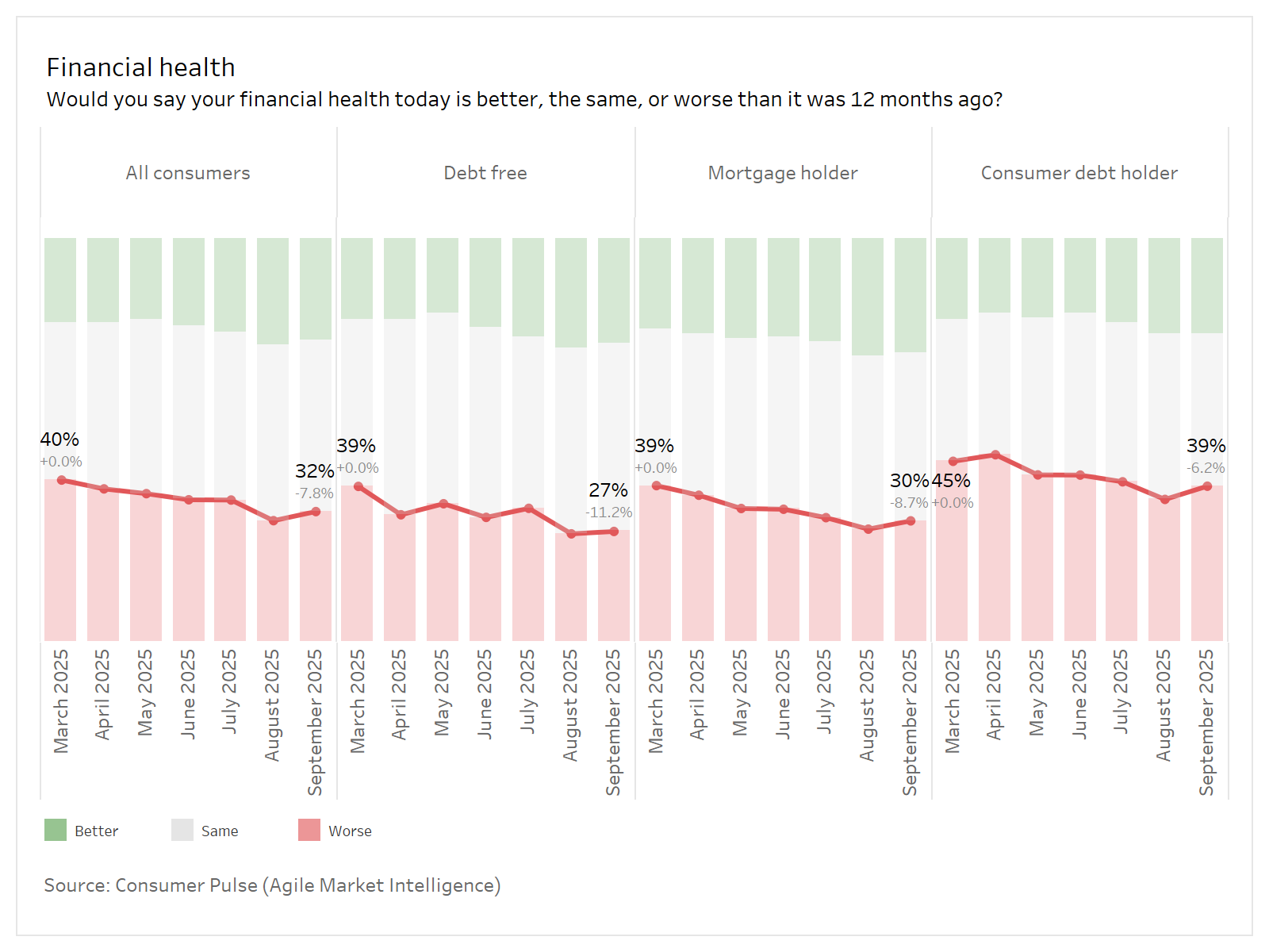 Director of Agile Market Intelligence, Michael Johnson commented that "The impact of recent rate cuts is clearly visible in our data, particularly among mortgage holders where we've seen a significant 9 percentage point improvement in financial health perceptions. This demonstrates how monetary policy changes can have a direct and measurable impact on household financial sentiment, with mortgage holders being among the first to feel the benefits of reduced borrowing costs. The data shows that when economic conditions improve, those with the most direct exposure to interest rate changes are quickest to experience the positive effects."