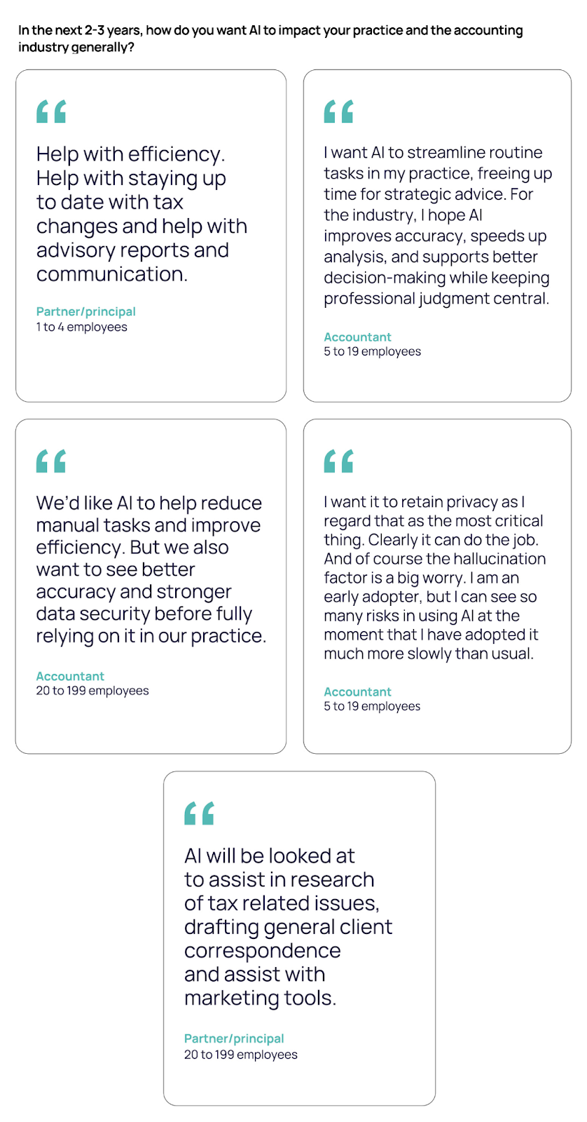 Practitioners want AI to reduce routine manual tasks so they can focus on giving strategic advice and improving client engagement. Research on laws and updates, report drafting and client correspondence emerge as key areas where AI can deliver immediate efficiency gains. As one partner at a large firm noted, “AI will be looked at to assist in research of tax-related issues, drafting general client correspondence and assisting with marketing tools.”