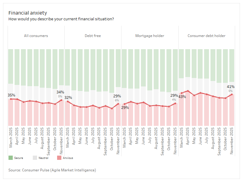 - 2 out of 5 consumer debt holders (41%) reported feeling financially anxious in November.