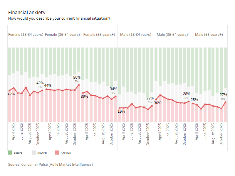 - 1 in 2 females aged 35-54 years old are the most financially anxious age/gender group in the population, which saw a 7% increase from last month.