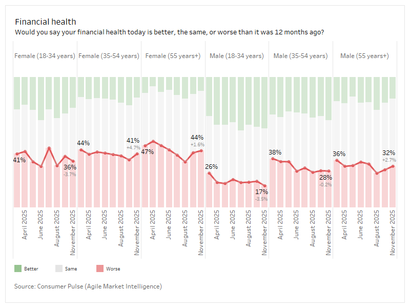Females and males aged 18-34 years old feel that their financial situation has either improved or stayed the same in November. Less females in this group are worried, with a 3.7% decline, while 3.5% less males are concerned as well. By contrast, females aged 35+ years and males 55+ years feel that their financial health has worsened. Women aged 35-54 years old in particular have the biggest percentage jump, with 4.7% more females expressing that their situation has worsened. This is followed by males 55+ years, with a percentage jump or 2.7%. The largest group that feels their financial health has worsened at present are women aged 55 years and above, occupying 44% of this demographic.