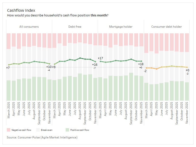 - Mortgage holders have the most positive cash flow at +18, and did not experience any drops in November.