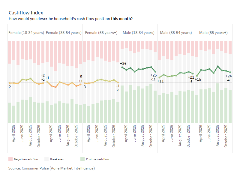 Interestingly, while males reported more positive cash flows compared to females, all male age groups have seen their cashflow drop in November. For males aged 18-34 years old, finances dropped by -11 points compared to last month, the biggest drop amongst all age and gender groups. The cash flow of males aged 35-54 years dropped by -5 points, and those aged 55+ years dropped by -4 points. By contrast, females aged 18-34 years old and 35-54 years old reported cash flow increases by +2 and +4 points, respectively. Females aged 55 years and above is the only female group to have contracted in terms of cash flows, dropping by -6 points. Whether the decreased cash flow comes from increasing cost of living, or increased spending is unclear.
