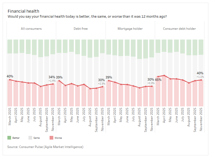 - Consumer debt holders have the largest share of households saying their financial situation is worse at 40%.