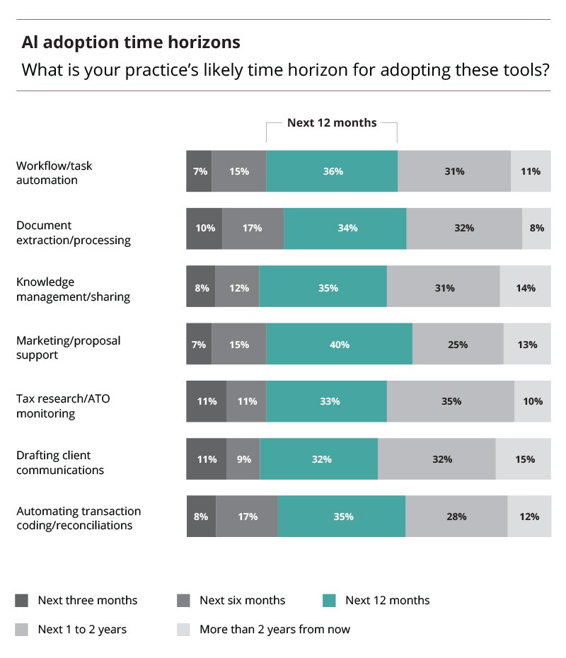 - Firms also anticipate AI support in more complex tasks such as tax research/ATO monitoring (33%) and drafting client communications (32%).