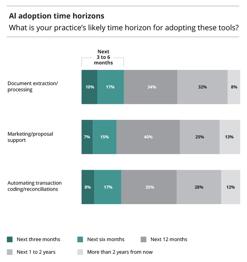 In the near-term, firms are optimistic that AI will ease their workloads by automating simpler tasks such as document extraction/processing and transaction reconciliation. Similarly, accountants expect immediate AI adoption for marketing/proposal support, which would allow them to rechannel efforts to improve business materials rather than building from scratch, block by block.