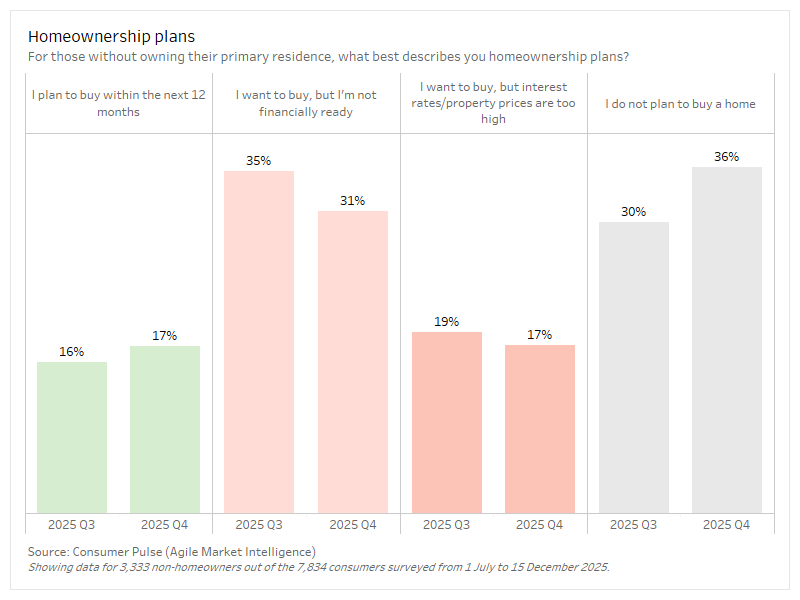 A polarisation in homeownership sentiment is observed among Australians without ownership of their primary residence, according to new research from Agile Market Intelligence’s Consumer Pulse survey (October to December 2025). While 17% now plan to buy within the next 12 months (up from 16% in Q3), those completely abandoning homeownership dreams have also grown to 36% (up from 30%).