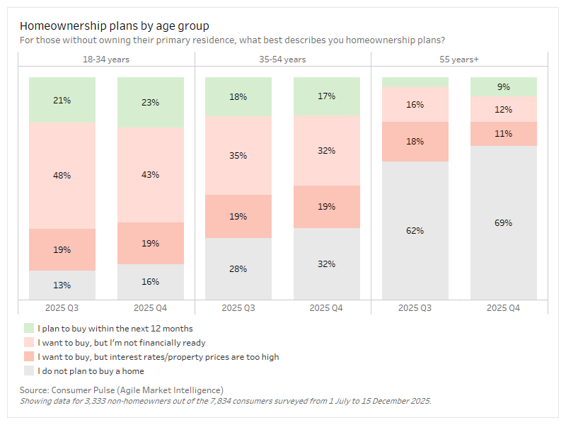 - Australians aged 55+ showed the sharpest shift toward rejection, with 69% now ruling out homeownership entirely, up 7 percentage points from 62% in Q3.