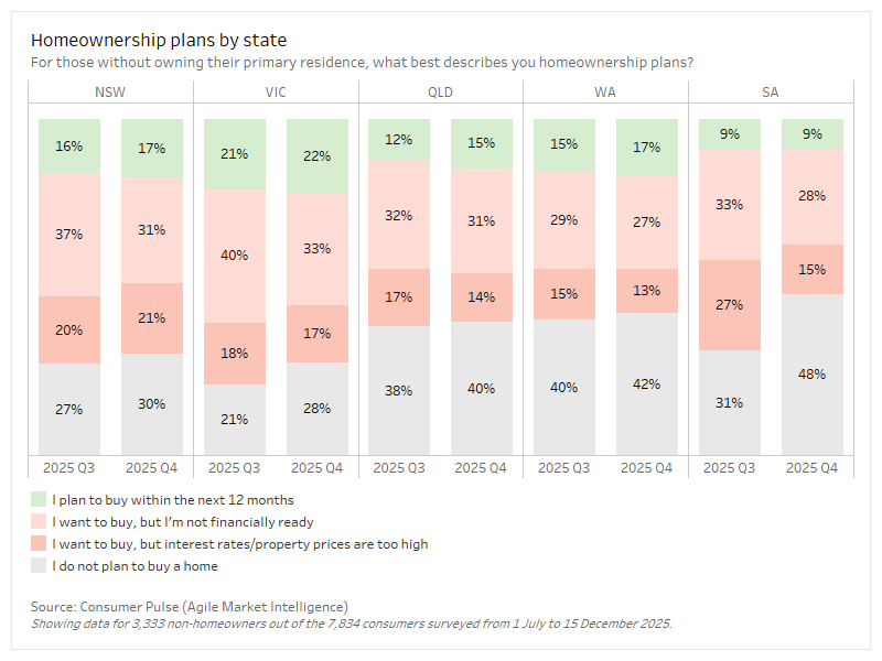 This article is based on findings from Agile Market Intelligence’s Consumer Pulse survey, conducted from 1 July to 15 December 2025. The data presented are for 3,333 non-homeowners among the 7,834 Australian consumers surveyed. Agile looked at patterns across age groups and states.