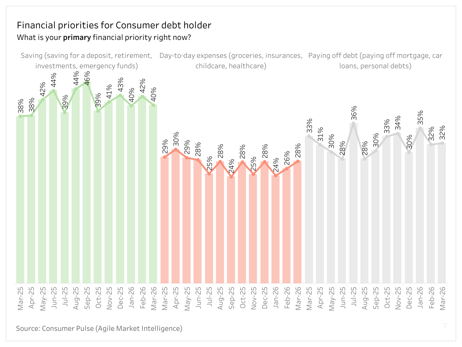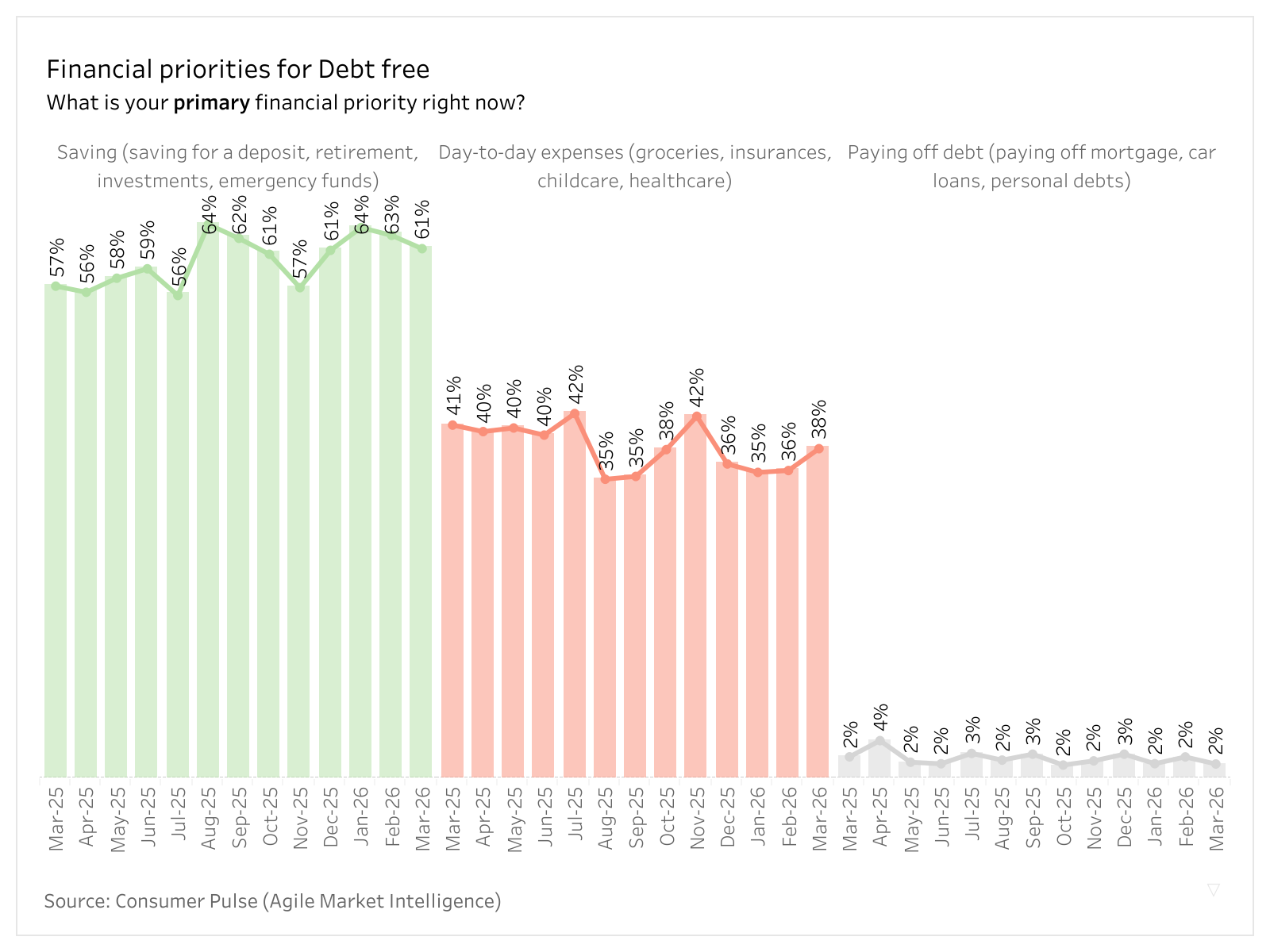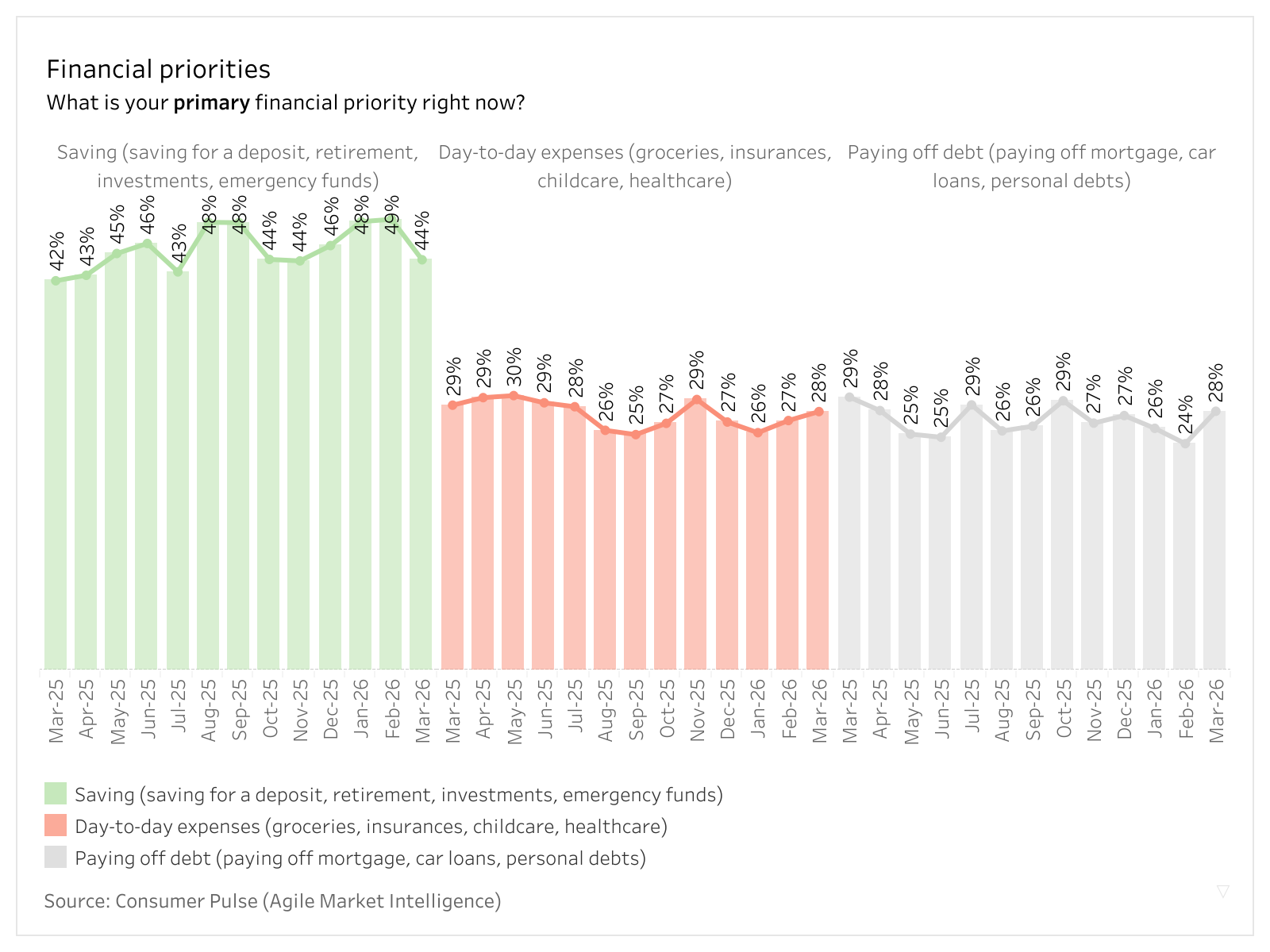 Agile Market Intelligence tracks the financial priorities of Australian households through its Consumer Pulse survey. Conducted across March 2025 to March 2026 Australians holding a range of financial products including mortgages, loans, credit cards and investment accounts were asked about their top financial priority for the current month. Results were weighted to reflect national population profiles by age, gender, and state.