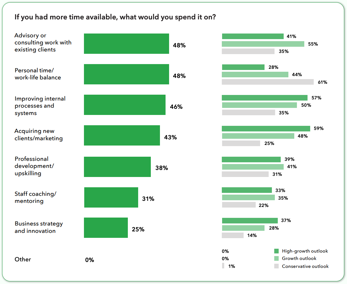 In terms of allocating extra time, high-growth firms treat them as a growth asset, using it to acquire new clients (59%) and improve internal processes (57%).