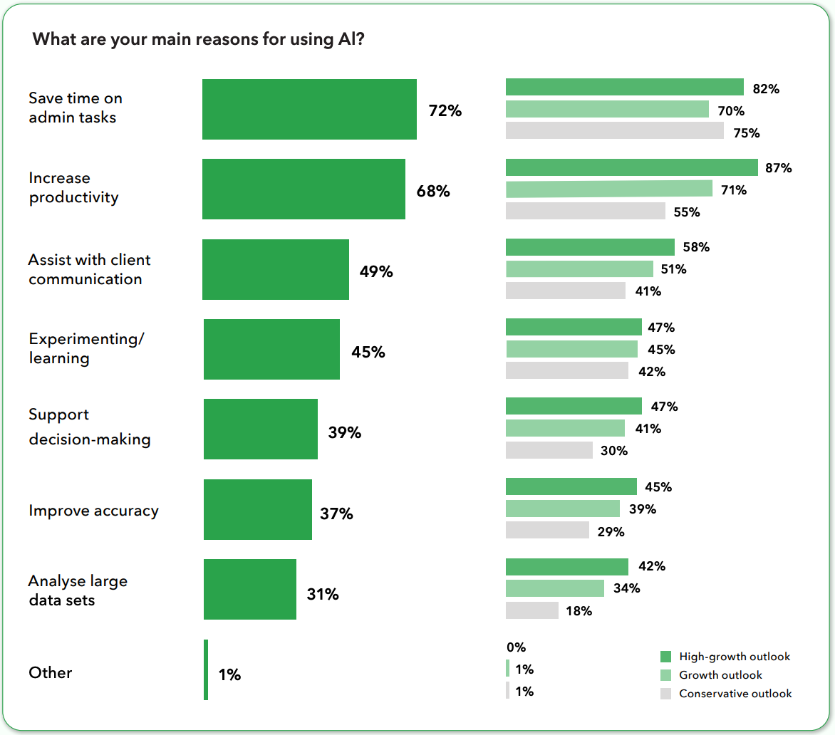 While reducing administrative workload remains a core driver (82%), high-growth firms use AI to boost productivity (87%), improve client communication (58%), and analyse large data sets (42%), demonstrating how efficiency gains are translated into scalable growth.