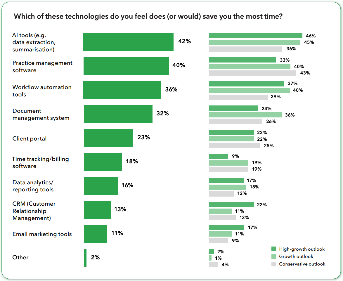 - 42% of accounting practices perceive AI as the leading time-saving tech, higher than practice management software (40%).